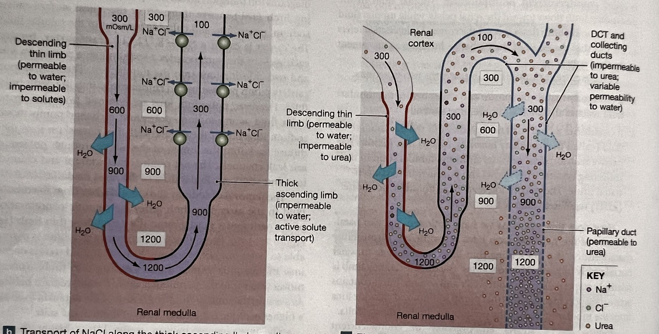With the amount of solutes left over in the nephron loop after giving up water in the decending side, and water not allowed to pass while only solutes can pass the membranes on the accending side….this drives the concentration gradient to be higher