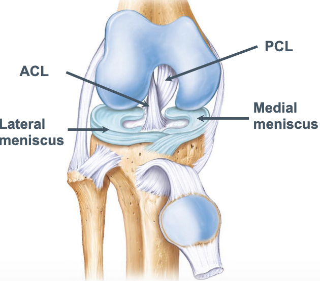 - posterior, intercondylar tibial plateau –> anterior part of lateral femoral condyle