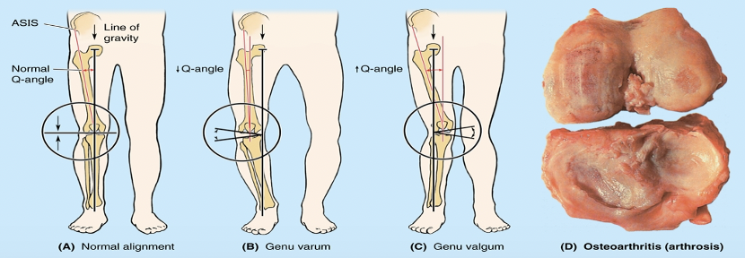 Oblique arrangement of femur in the thigh places the tibial axis directly under femoral head and weight centered in the middle of the tibial plateau. With varus and valgus stress on the knee, weight is shifted over one side of the tibia, which can cause wearing of the joint cartilages and ligament articular cartilage (osteoarthritis), meniscus, MCL/LCL.