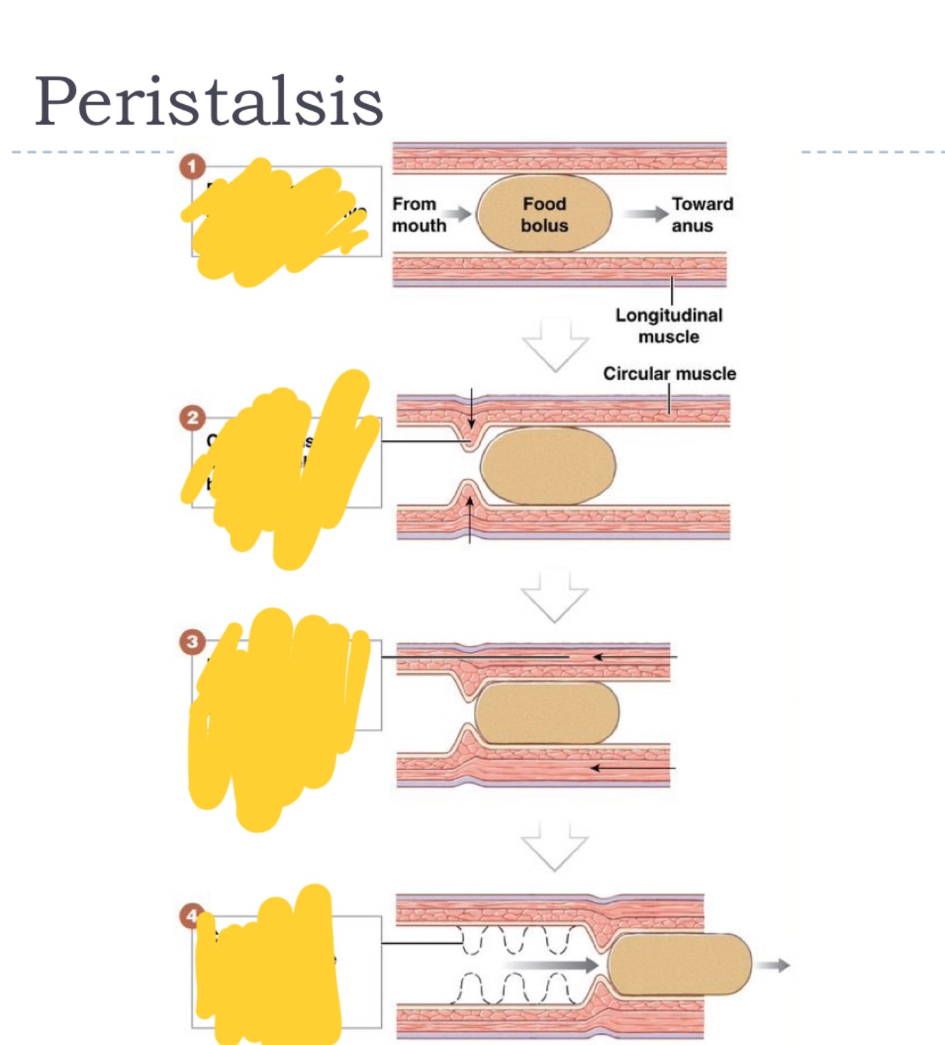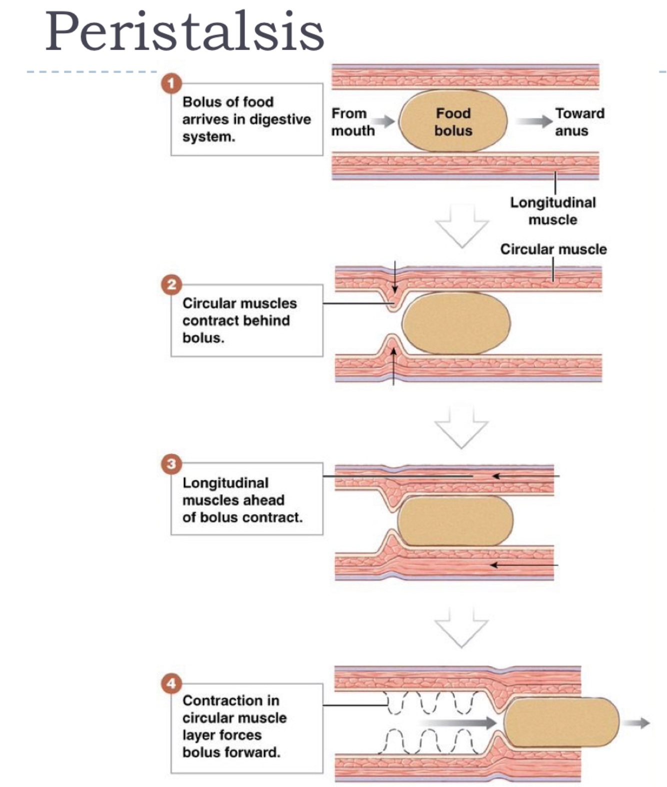 circular muscle behind food and contraction of longitudinal muscle.