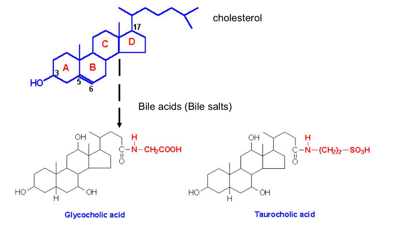 synthesised from cholesterol in liver and stored in gall bladder as bile