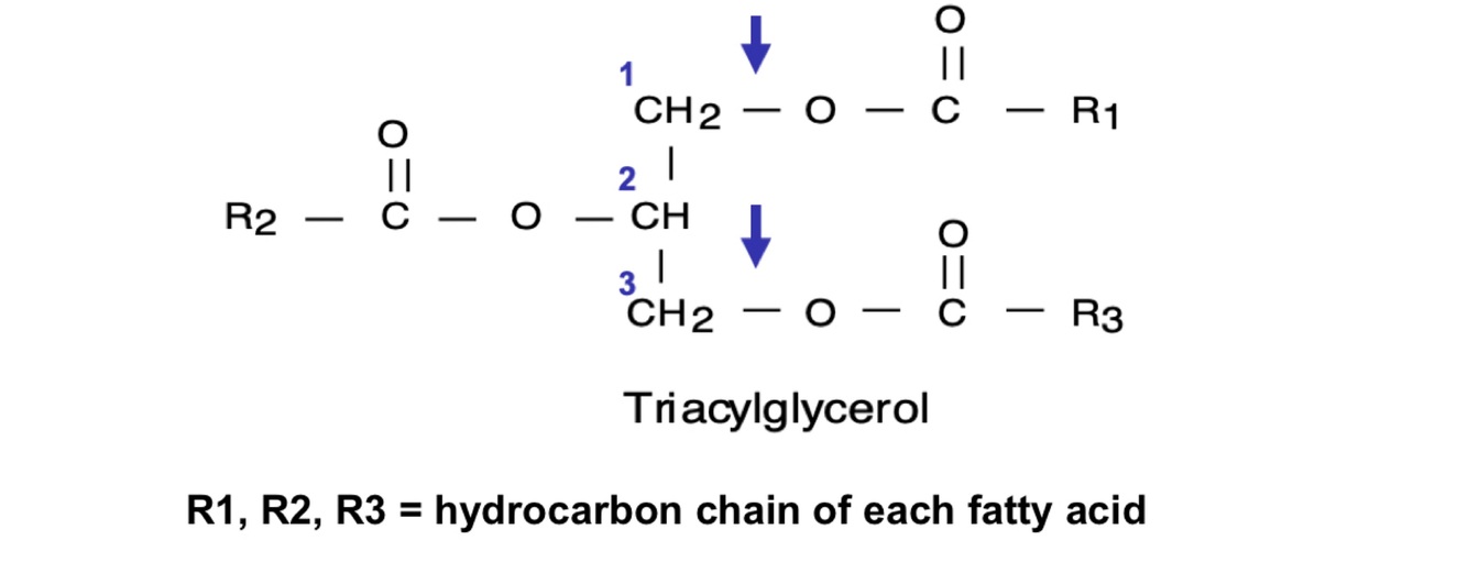 Pancreatic lipase/collipase enzyme system hydrolyses triacylglycerols to free fatty acids and 2-monoacylglycerol - diagram, what does R1, R2 and R3 mean
