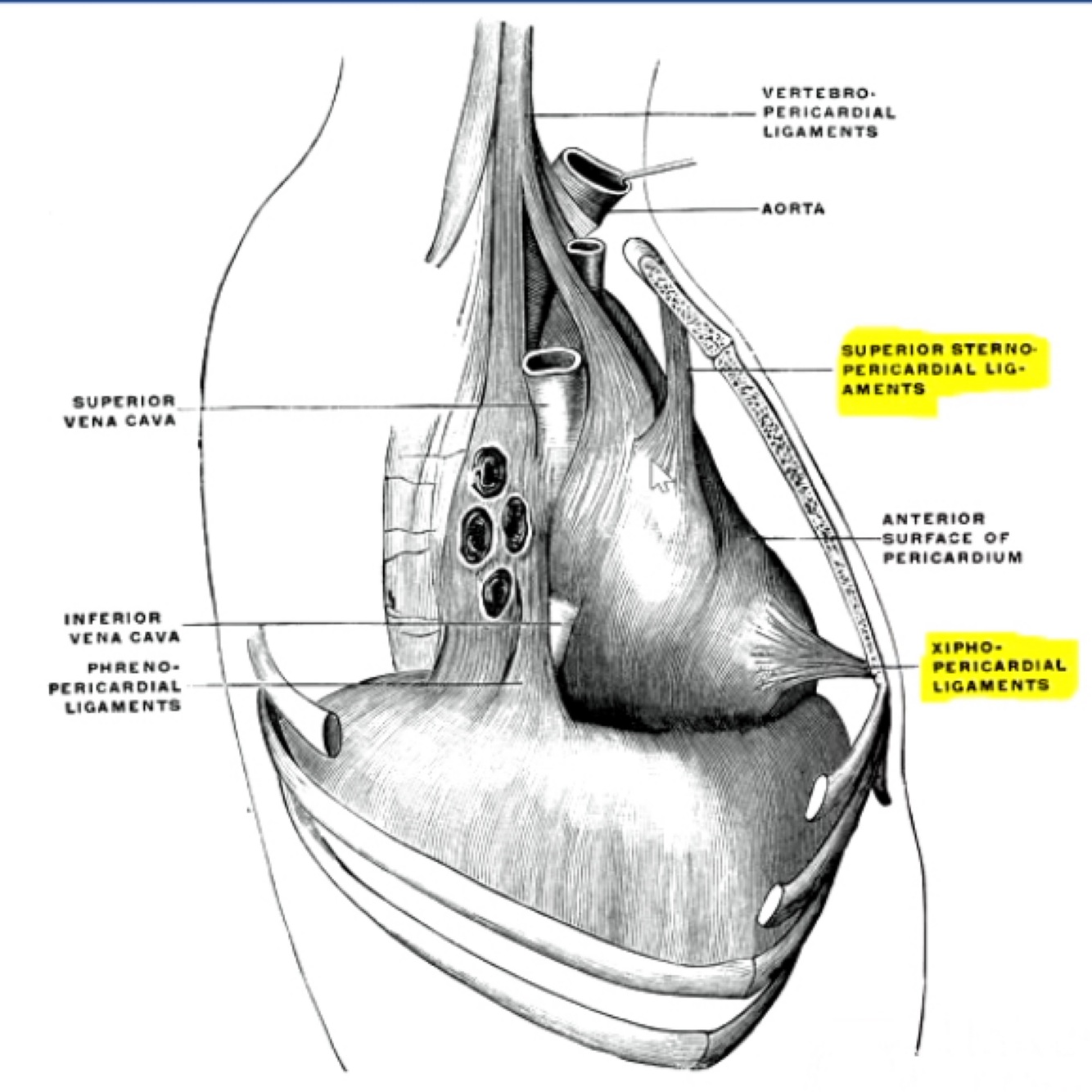 Connective tissue which attaches the pericardium to surrounding structures (vertebra, sternum, xiphiod, diaphragm)