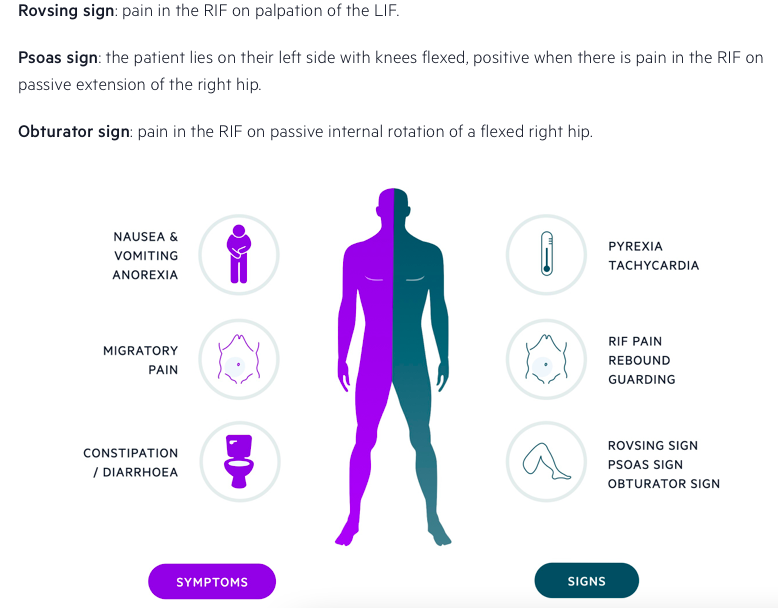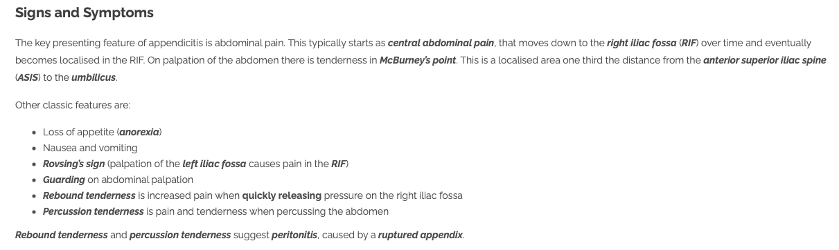 * **Patient laying completely still** * Abdominal pain * Nausea and vomiting * Fever * Shock/Low blood pressure * Tachycardia * **Guarding** * **Rebound tenderness**