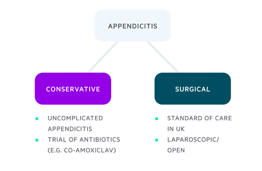 • If positive laparoscopic appendicectomy, risk of turning to laparotomy. Start antibiotics before surgery and only continue for 7 days if pus found on surgery