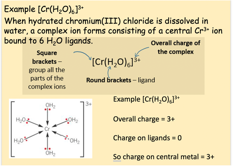 Consists of a central metal ion with one or more molecules / charged ions (ligands) bound to it by dative covalent bonds