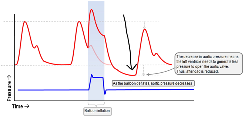 The image below shows the arterial pressure (red, upper line) and balloon pressure