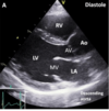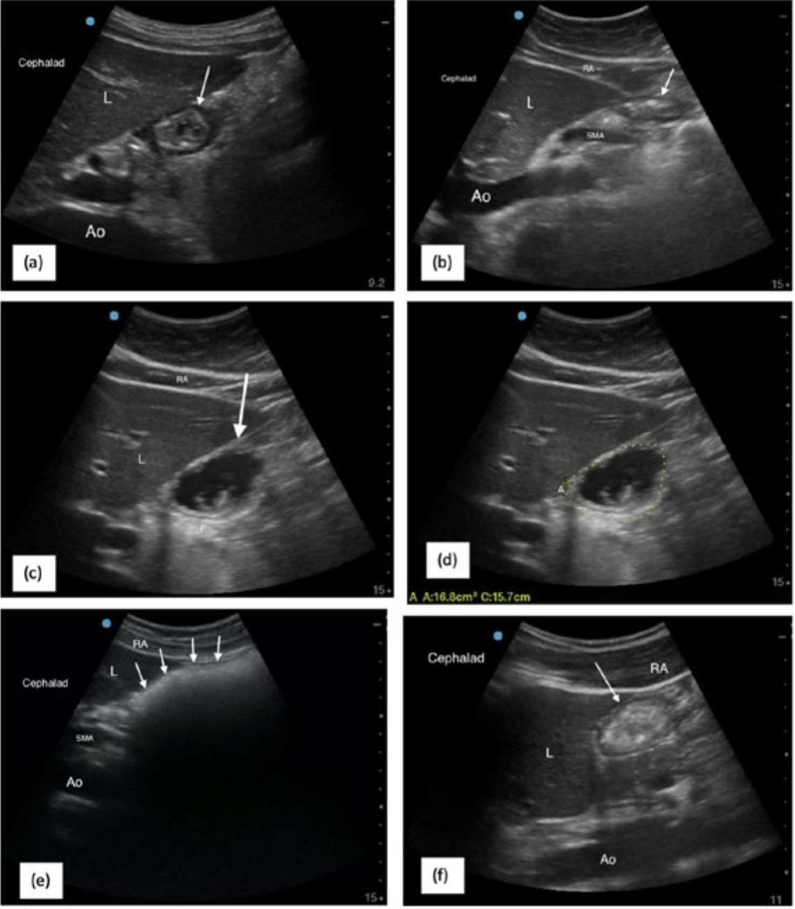 (f) Hyperechoic late- stage solid content. Arrows = antrum; L = liver, Ao = Aorta, RA = rectus abdominis muscle