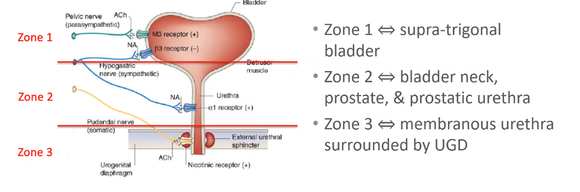 Which structures make up the 1st, 2nd, and 3rd anatomic/physiologic zones of the lower urinary tract?