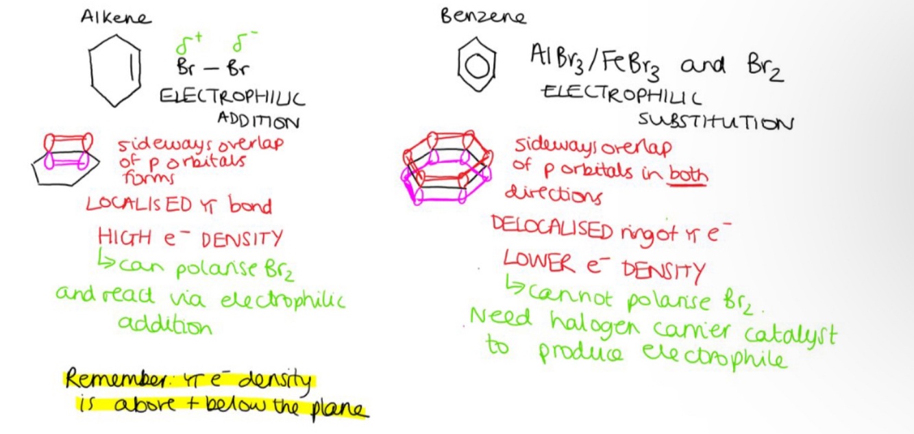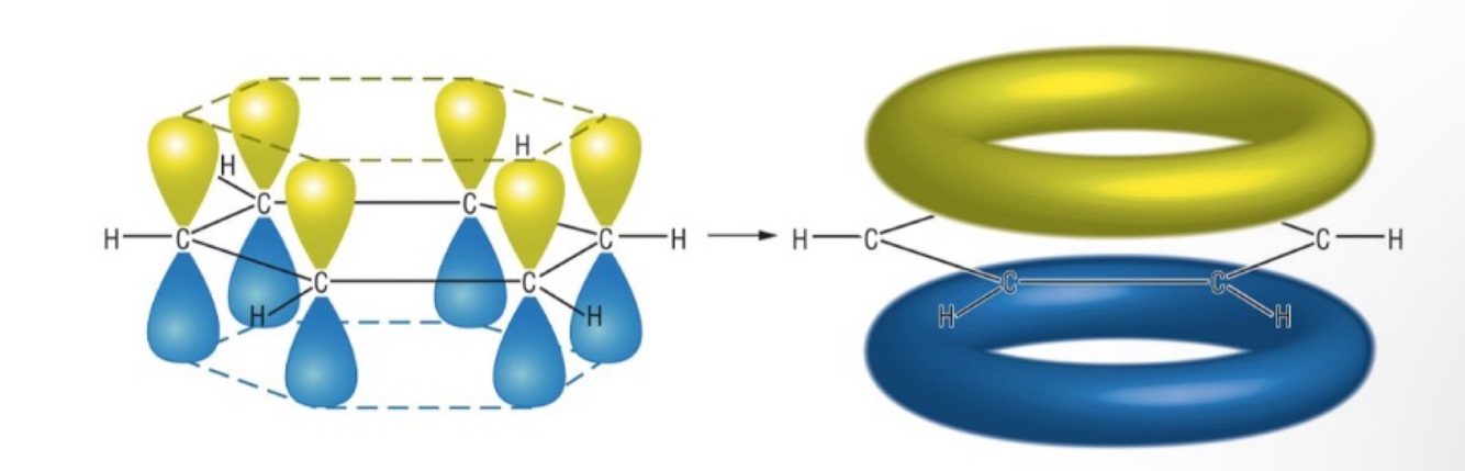 • Sideways overlap of p-orbitals creates a delocalised ring of electron density above and below the plane of the benzene ring