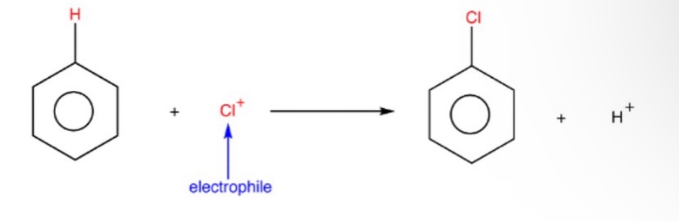 • When benzene reacts with an electrophile, a hydrogen atom is replaced by another atom or group of atoms.