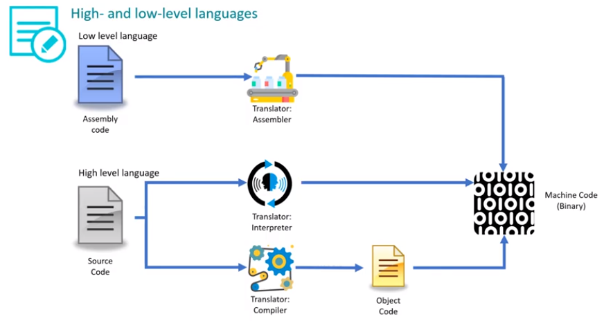 Code written in both assembly and high-level source code is converted into binary machine code for execution.