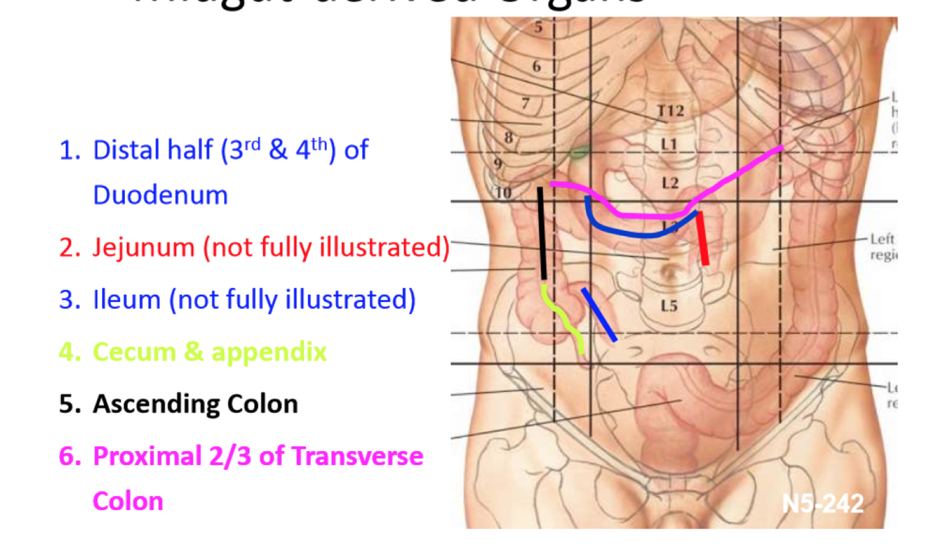 esophagus, stomach, liver, gall bladder, pancreas, 1st and 2nd portions of the duodenum