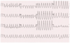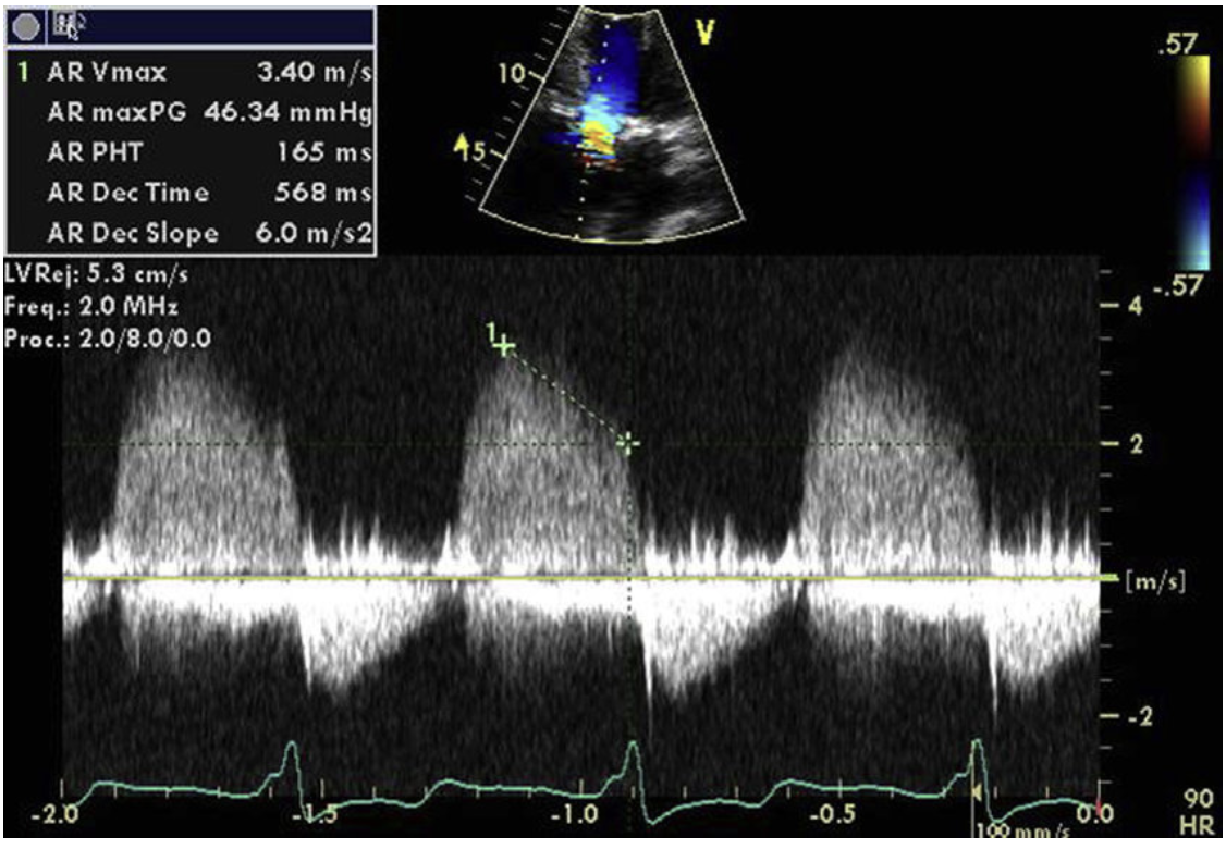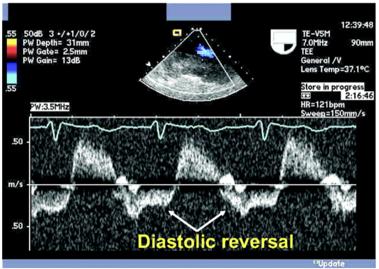 Aortic dissection. This Doppler trace obtained by transoesophageal echocardiography of the descending aorta (see far right) suggests