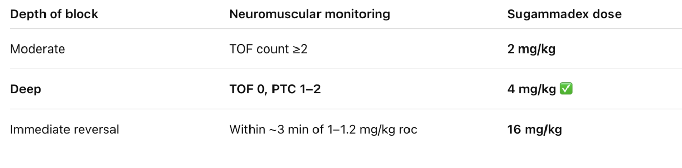 Intubate with 1mg/kg rocuronium. Surgery ceases. TOF count 0. PTC 2. What dose sugammadex to give?