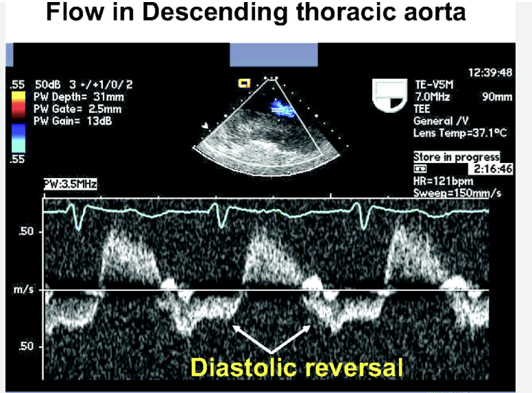 This Doppler trace obtained by transoesophageal echocardiography of the descending aorta (see far right) suggests