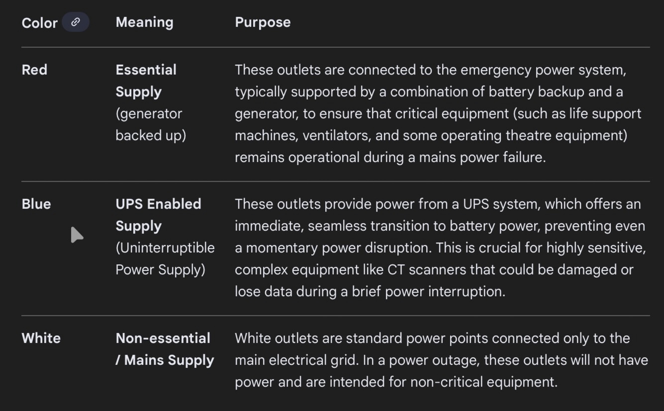 Electrical circuits connected to the UPS are denoted by a dark blue power socket, and are reserved for essential equipment without adequate battery backup.