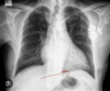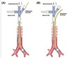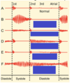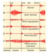 Aortic dissection. This Doppler trace obtained by transoesophageal echocardiography of the descending aorta (see far right) suggests