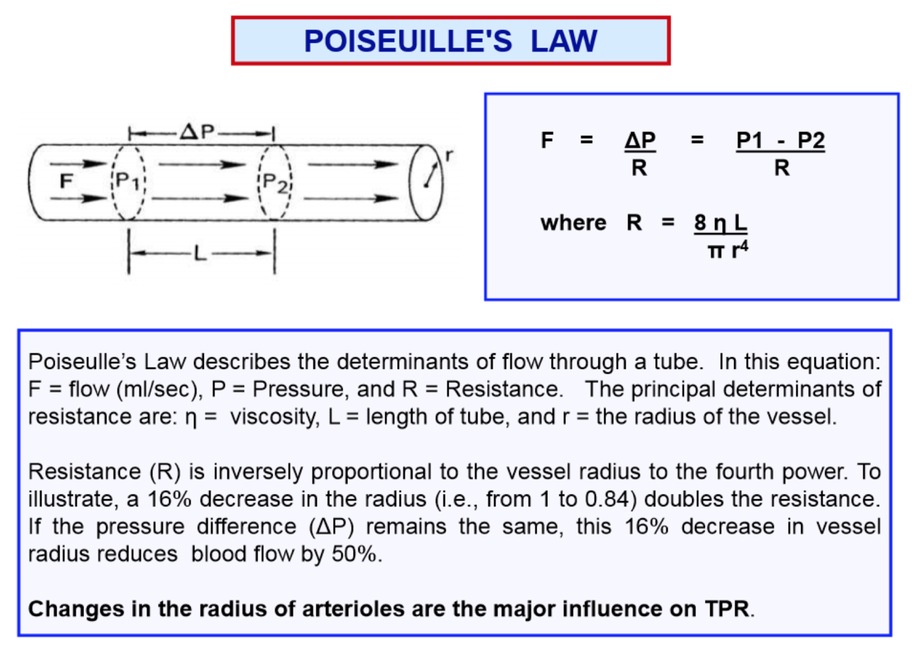 Poiseulle’s law describes flow through a tube. It states that resistance to flow in a tube is most determined by the radius of the tube.