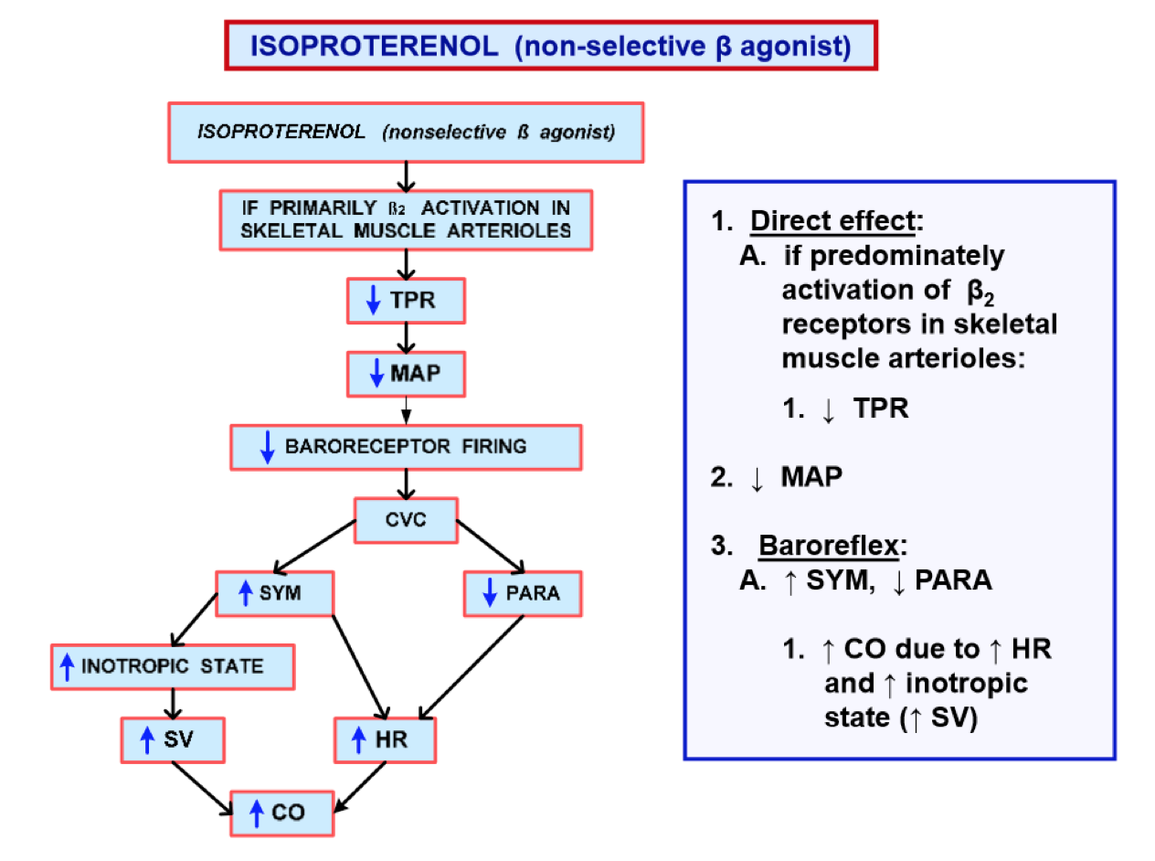 How will Isoproterenol if it primarily affects Beta 2 activation receptors affect MAP, and what will the baroreflex response be?
