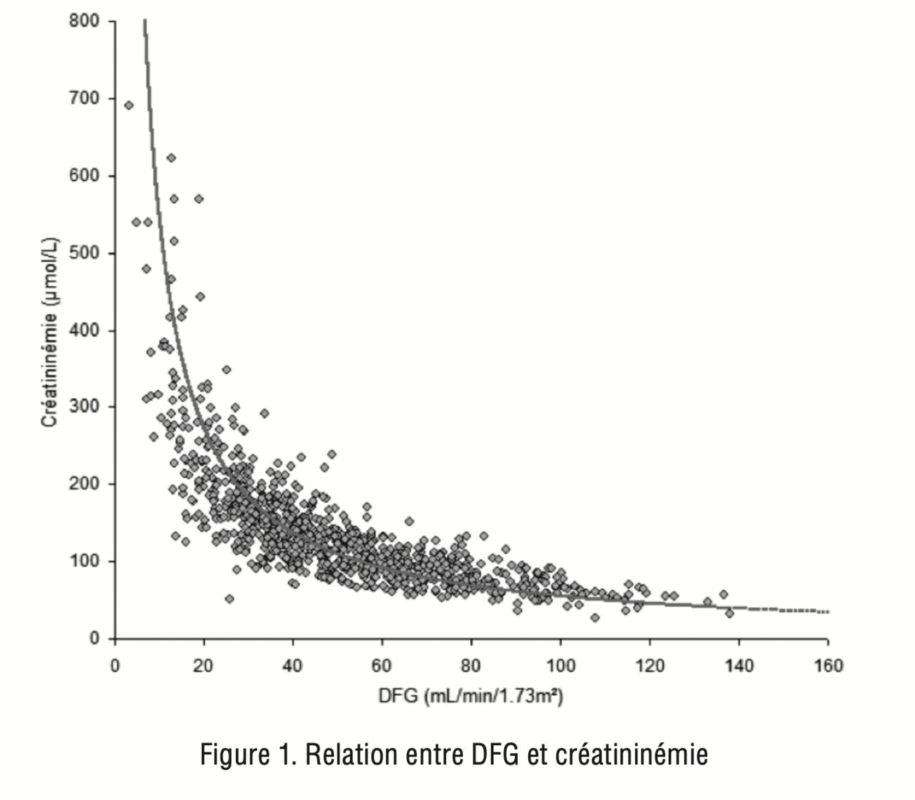 Il existe une relation hyperbolique inverse entre le DFG et la créatininémie.
