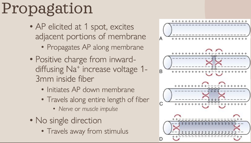 Describe what propogation of an action potential across neurons involves.