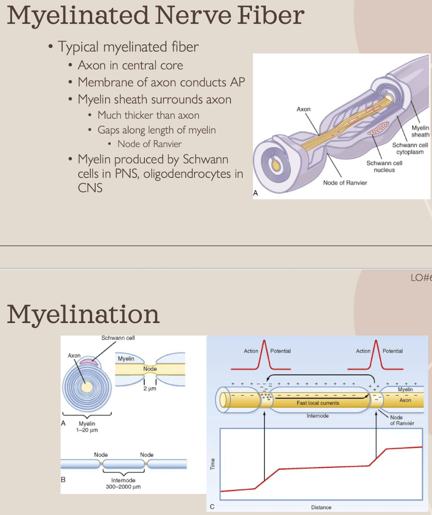 Describe the anatomy of a myelinated nerve fiber. What purpose does a myelin sheath serve?