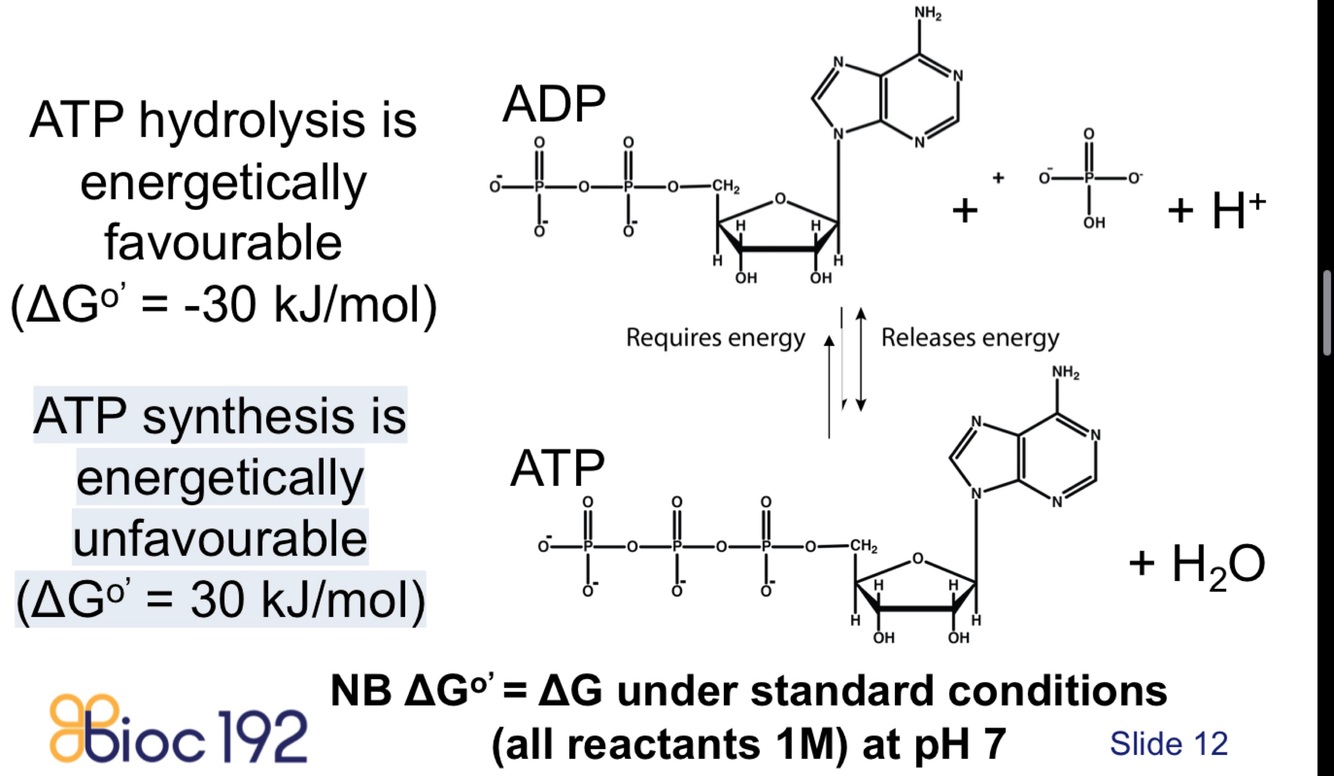 ATP synthesis is energetically unfavourable (ΔG’ = 30 kJ/mol)