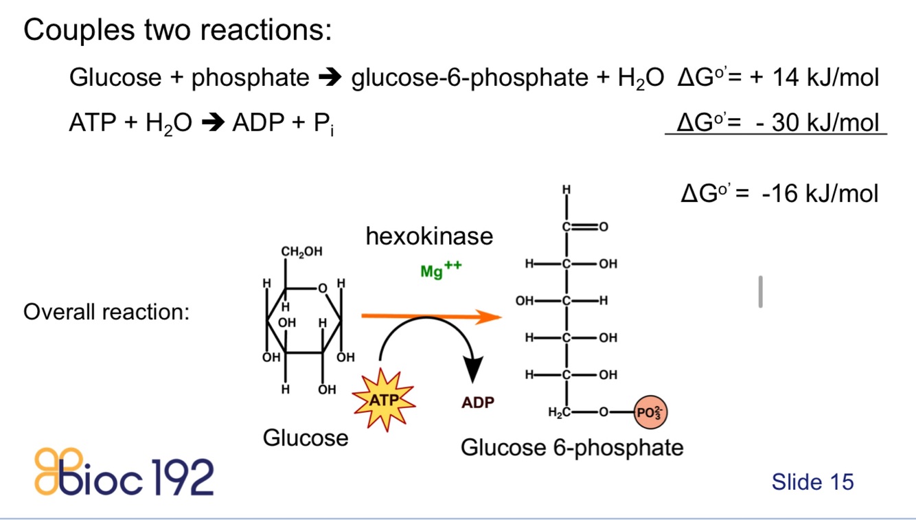 Reaction coupling example - the hexokinase reaction (glycolysis first step) what does it do (in terms of coupling) to make glucose 6-phosphate.
