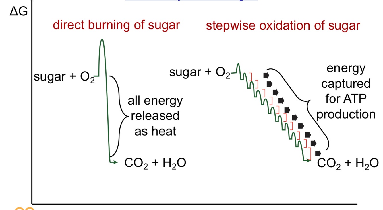 Stepwise oxidation of fuel molecules occurs in the pathways - how does this compare to the direct burning of sugar?