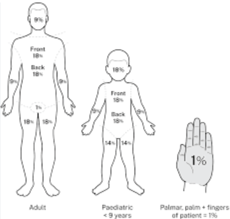 rule of 9s except take 9 from the legs and put it in the head so head is total 18