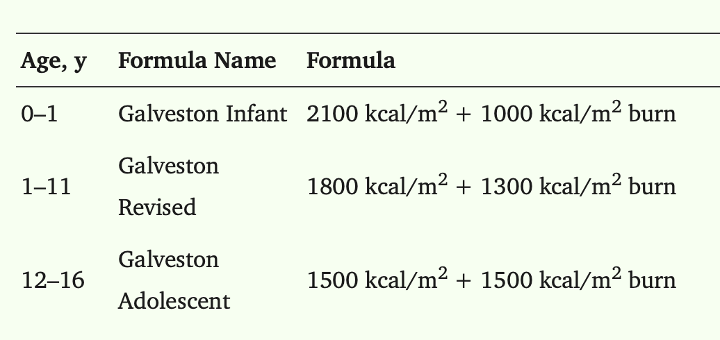 nutrition supplementation for child with burns, table shows caloric requirements by age