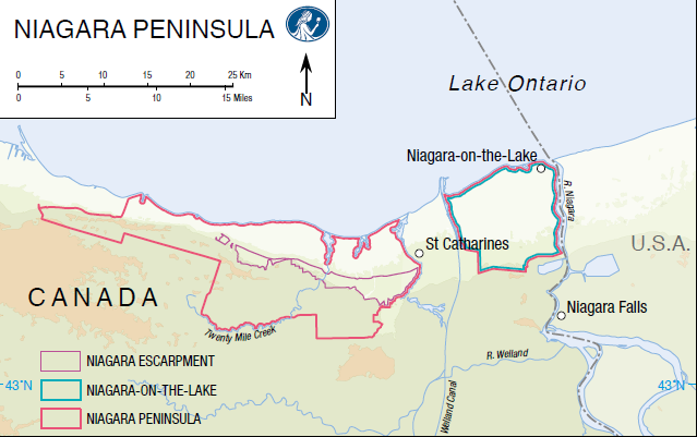 Niagara Escarpment has benches and gentle slopes facing north –> altitude and airflow cool vineyards –> high acid wines from Chard, PN, Riesling
