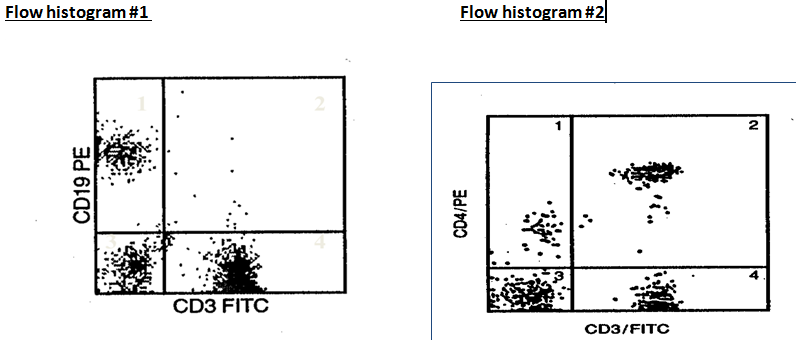 Refer to the attached histograms. In flow histogram 1, indicate what cells are present in quadrants 1 and 4. In flow histogram 2, indicate what cells are present in quadrant 2.