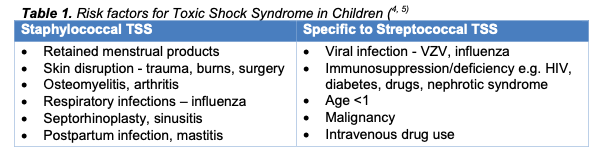 What are some risk factors for toxic shock syndrome in children?