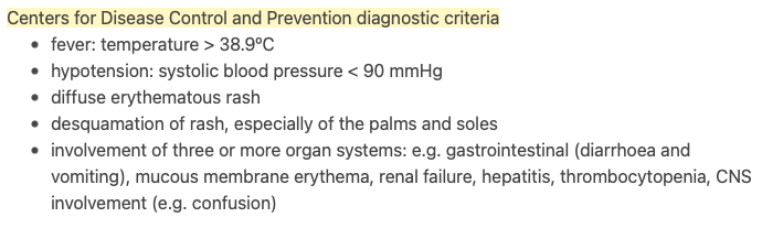What is the centre for disease control and prevention diagnostic criteria for TSS?
