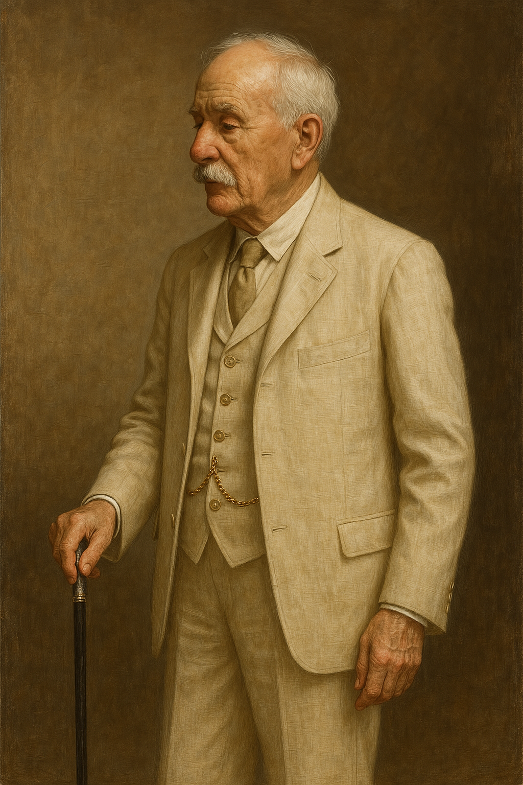 Aunque oía cada vez menos con el oído derecho y se apoyaba en un bastón con empuñadura de plata para disimular la incertidumbre de sus pasos, seguía llevando con la compostura de sus años mozos el vestido entero de lino con el chaleco atravesado por la leontina de oro.