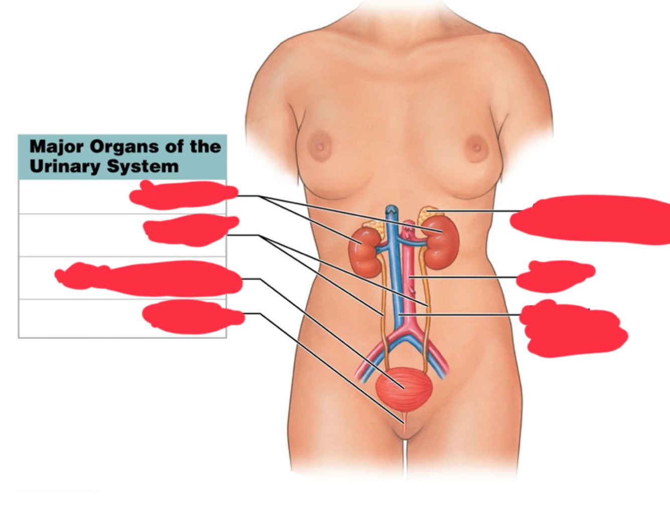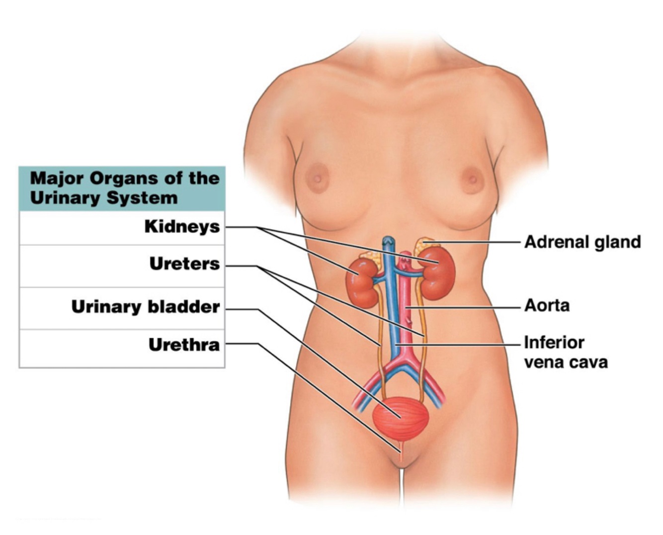 • 2 kidneys • 2 ureters • Urinary bladder • Urethra