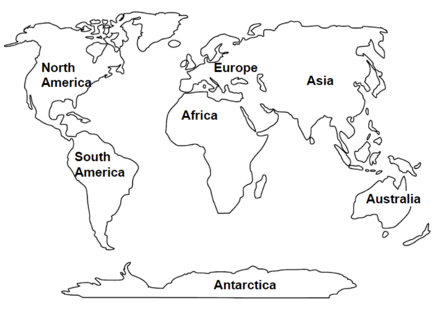 List the continents and identify where they are on the map below.