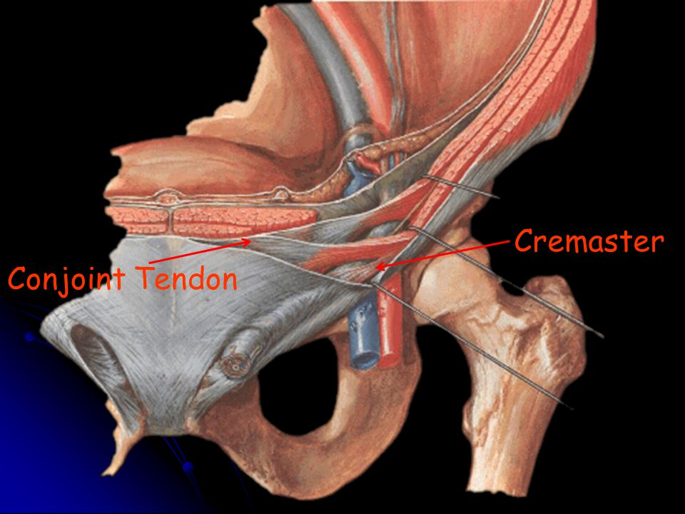Combined fibres from the lower internal oblique and aponeurosis of transversus abdominis muscle. Inserts onto pubic crest