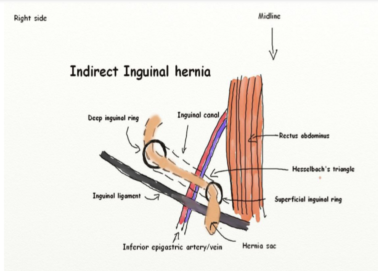 Describe the pathway of indirect inguinal hernias