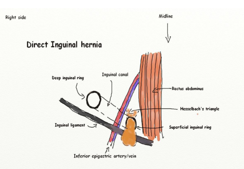 Describe the pathway of direct inguinal hernias