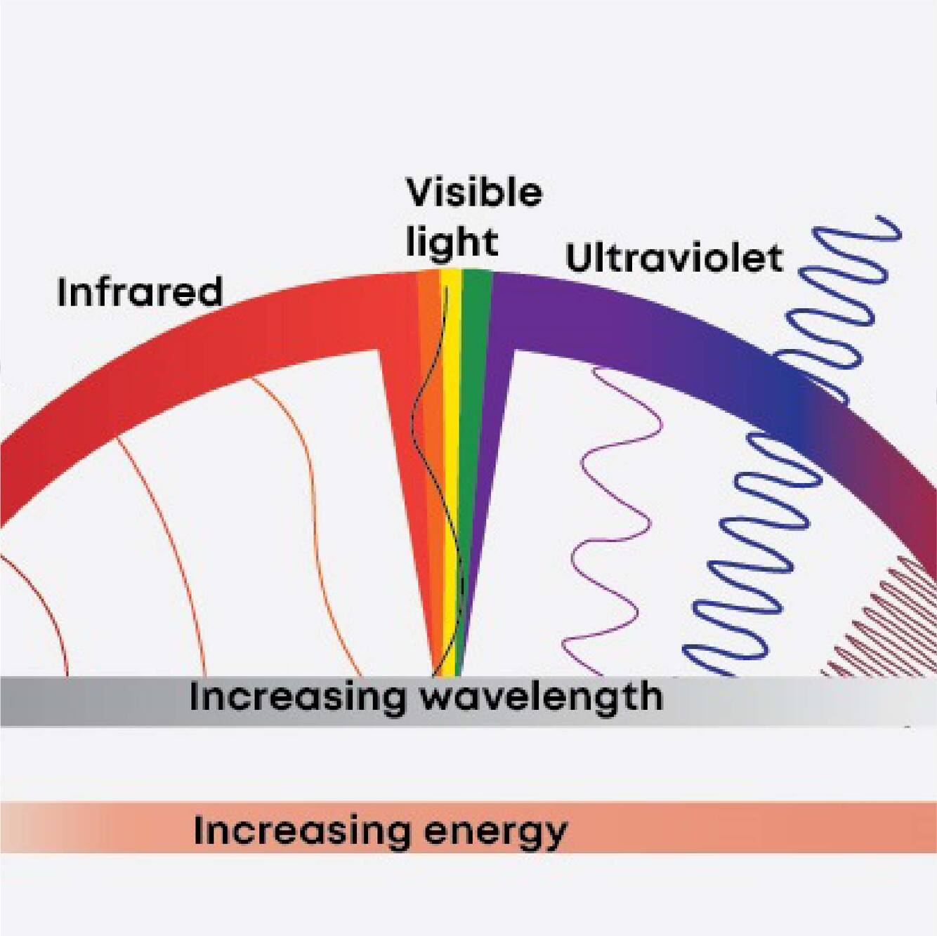 Ultraviolet (UV) radiation ## Footnote UV radiation has higher energy than visible light but can damage skin cells with overexposure.