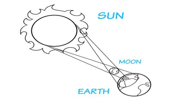 During a solar eclipse, the Moon moves between Sun and Earth, and blocks the Sun’s light from hitting Earth.