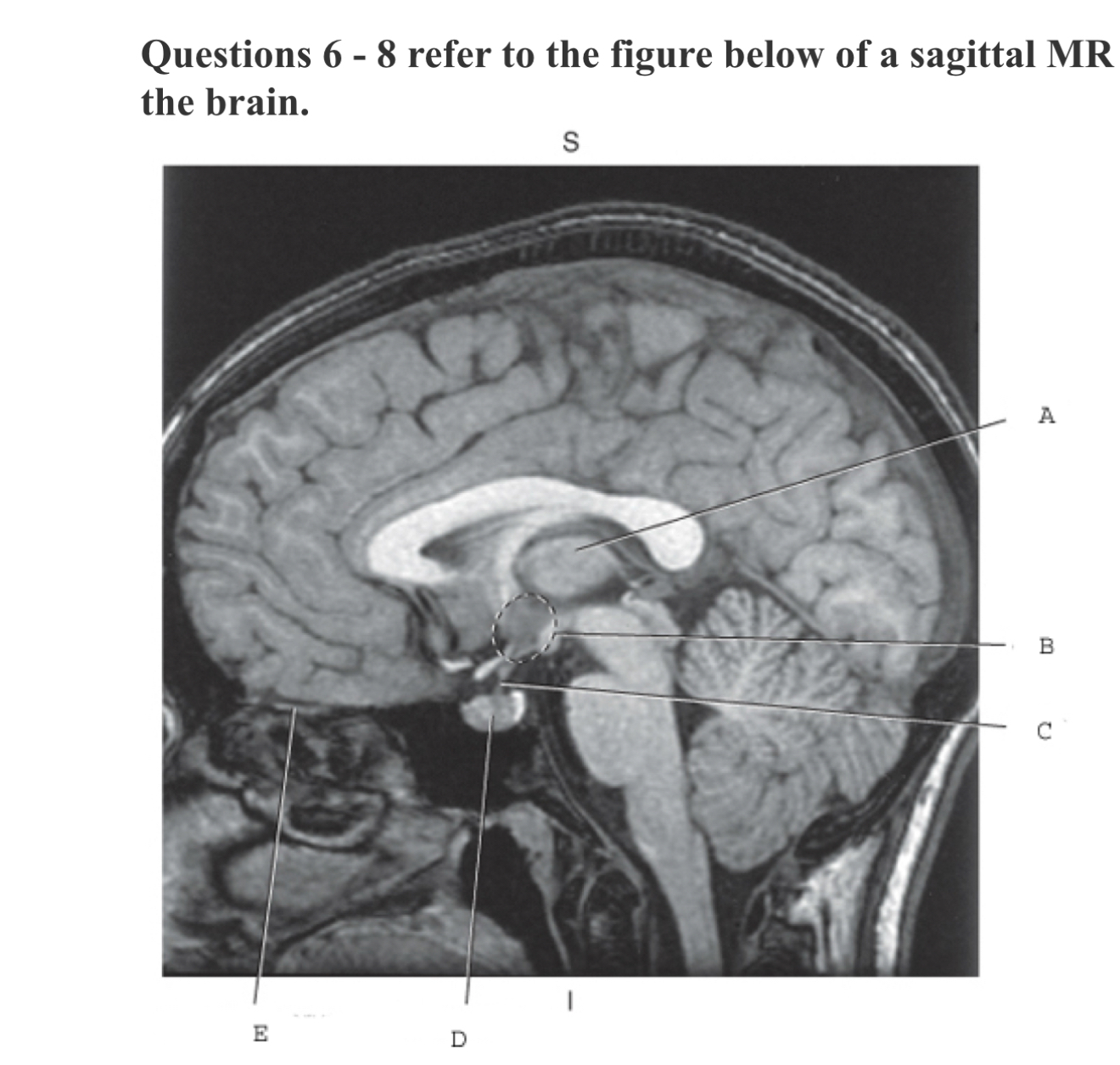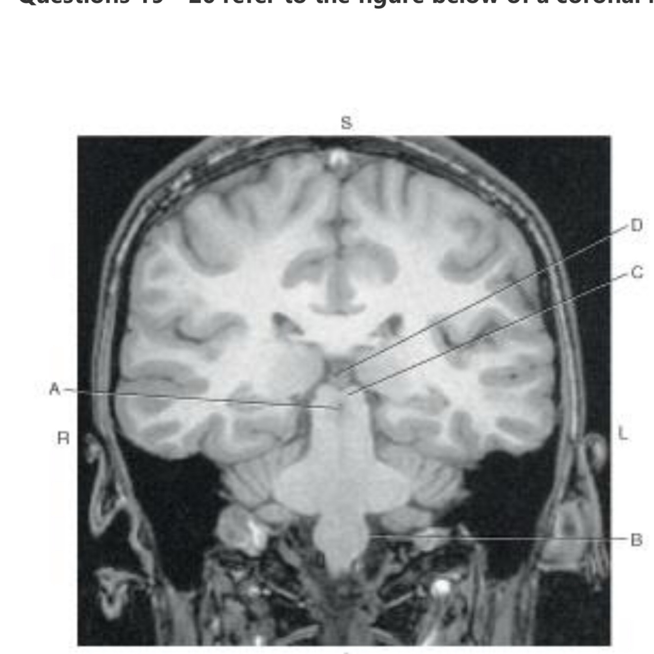 Which of the following is composed primarily of massive bundles of nerve fiber tracts and can be divided into two major segments: cerebral peduncles and tectum?