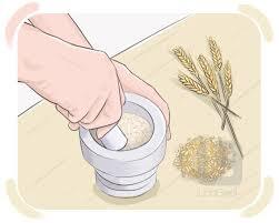 to keep rubbing something between two rough, hard surfaces until it becomes a powder
