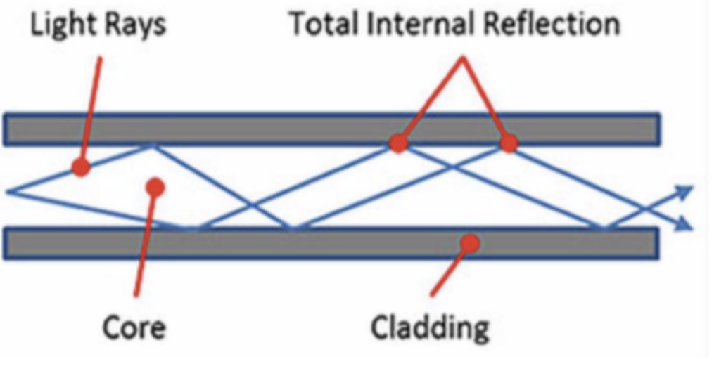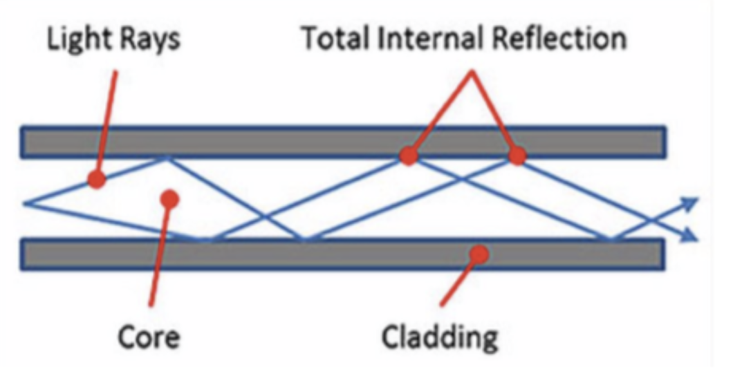 The outer layer has lower refractive index than the core which makes total internal reflection when light enters