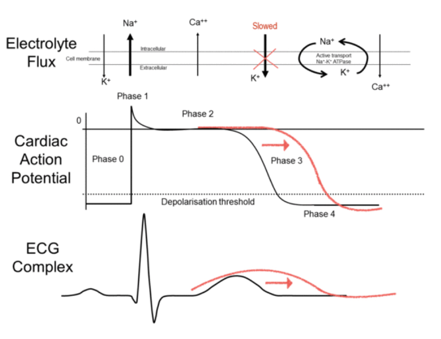 **prolonged QT can lead to “early after depolarization” (break of threshold leading to ectopic beats/torsades des pointes)