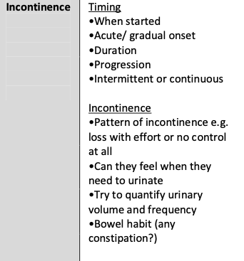 PC (see image): onset? intermittent or constant dribble? nocturia? eneuresis? volume of urine? issue when coughing? urgency?