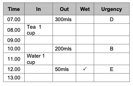 If a patient has urinary incontinence they may be asked to fill out a bladder diary. How do you complete one of these?